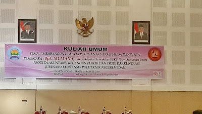 Medan | Neraca — Senin (14/3), Politeknik Negeri Medan menyelenggarakan kuliah umum di Gedung Z Lantai 5 pada pukul 08.00 WIB – 13.00 WIB dan dihadiri oleh mahasiswa Jurusan Akuntansi, Program Studi D4 Akuntansi Keuangan Publik(AKP)dan D3 Akuntansi, dengan tema “Membangun Budaya Kepatuhan Generasi Muda Indonesia”. Kegiatan yang diketuai oleh Bapak Firma Sibarani ini juga dihadiriPembantu Direktur III, Bapak Nisfan Bahri S.T, M.T, dosen-dosen dari Jurusan Akuntansi, dan Bapak Mulyana, Ak, Kepala Perwakilan BPKP Provinsi Sumatera Utara, selaku pembicara.